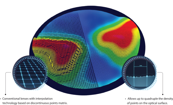 Unlike most progressive designs, which define optical conditions only at a limited set of points on the lens surface and then interpolate, CDT controls the entire lens surface continuously. By transmitting richer and denser sagittal data matrices to the generator, the system achieves higher optical resolution, ensuring sharper, wider, and more stable visual fields.